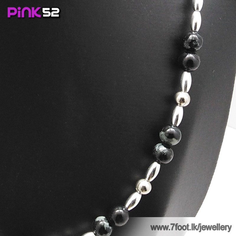 Black lines on light blue ball bead necklace